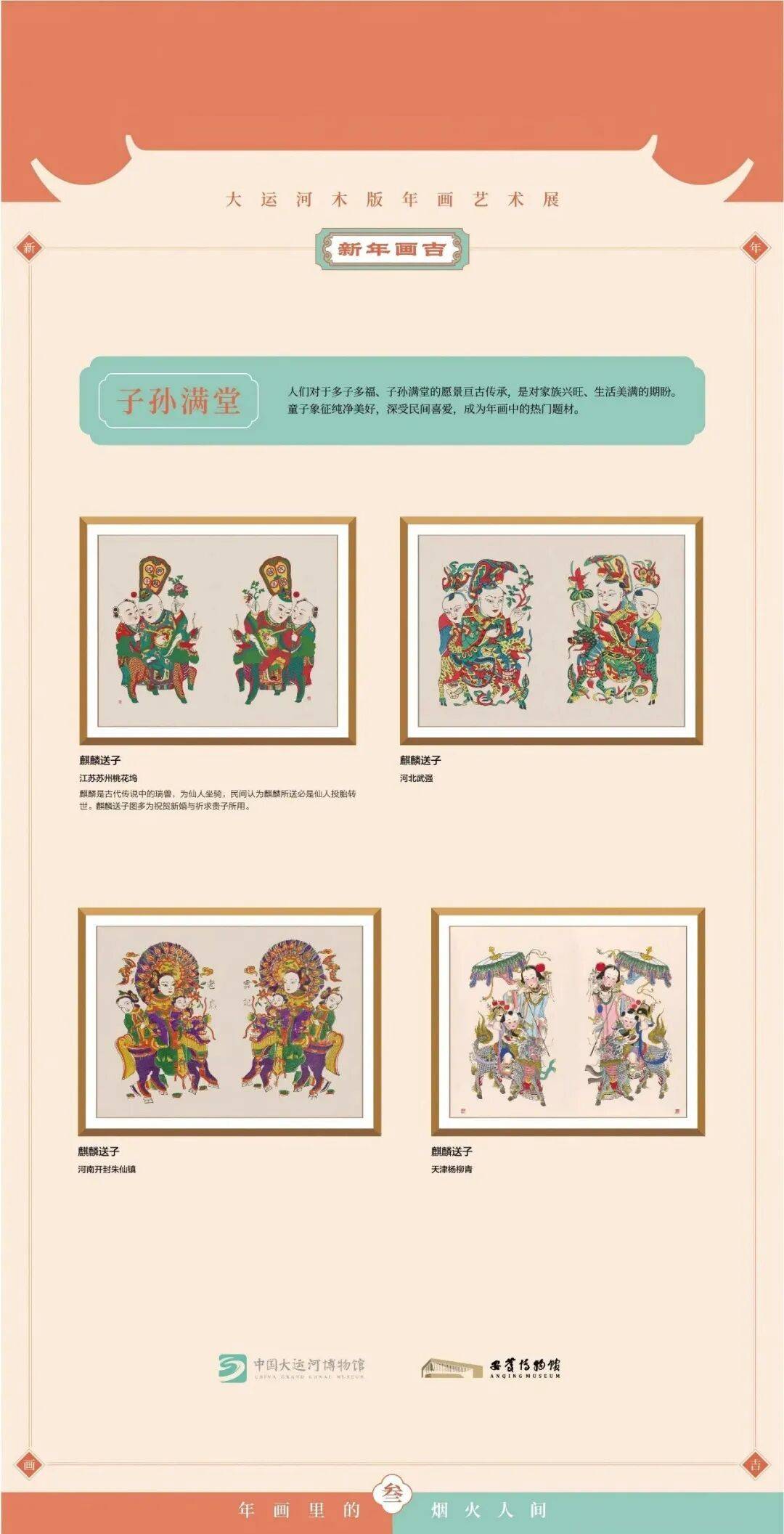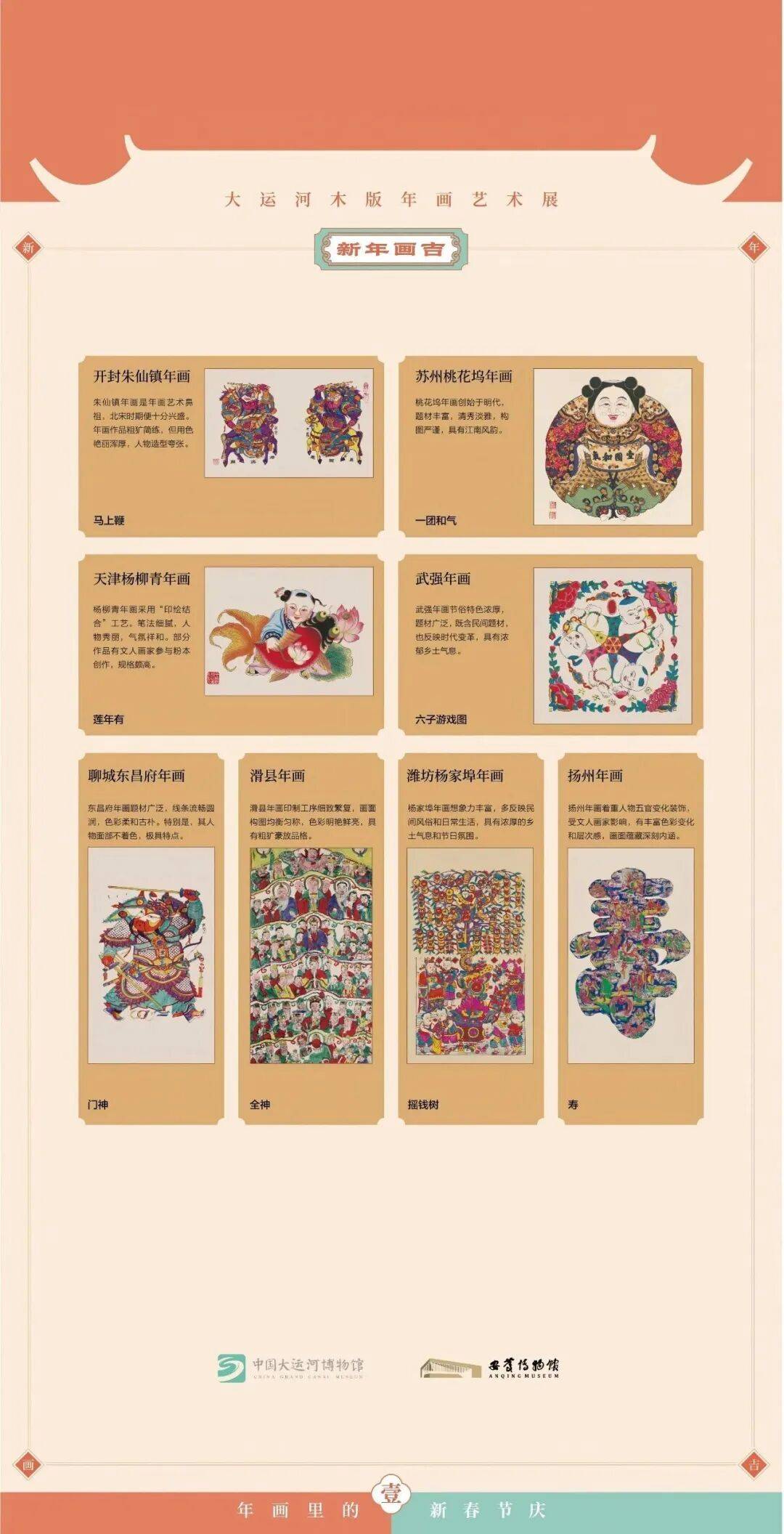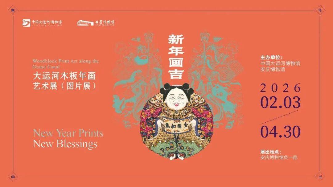 “千门万户曈曈日,总把新桃换旧符”。“贴年画”是全球华人在春节期间的重要年俗。本次展览由中国大运河博物馆、安庆博物馆联合主办,精选中国大运河博物馆馆藏年画作品,汇集了苏州桃花坞、天津杨柳青、聊城东昌府、潍坊杨家埠、开封朱仙镇、扬州、武强、滑县等大运河沿线多个城镇的木版年画珍品影像,以图片形式系统呈现运河沿线木版年画的多元风貌与艺术精髓,分为“年画里的新春节庆”“年画里的谐音祝愿”“年画里的烟火人间”三大篇章,层层递进地展现木版年画丰富的题材类型、鲜明的风格特色与深厚的文化内涵。